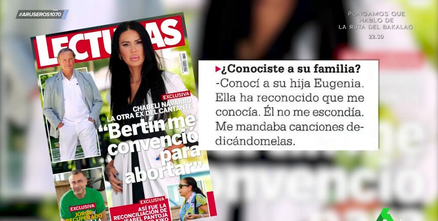 Alfonso Arús destaca en el plató de Aruser@s la portada de la revista 'Lecturas' en la que Chabeli Navarro asegura haber mantenido una relación de cinco meses con Bertín Osborne a pesar de que el cantante lo desmintiera en su momento. Chabeli Navarro cuenta que se quedó embarazada y a las 11 semanas se lo comunicó a Bertín Osborne, cuya relación a partir de ese momento cambió.