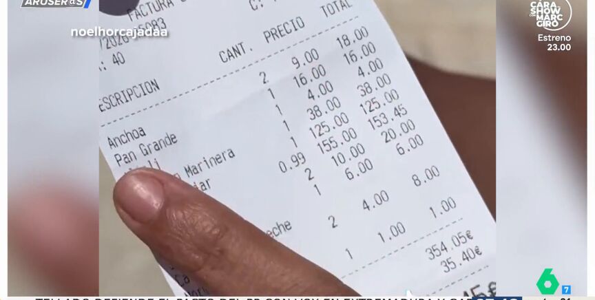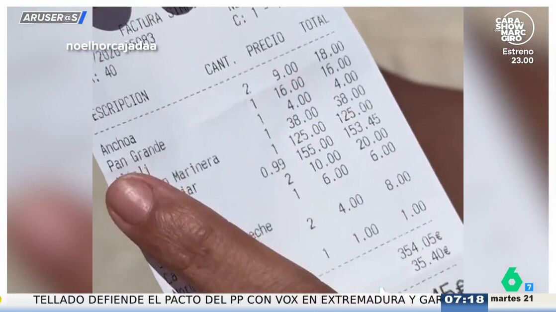 "Es un auténtico atraco", comenta Hans Arús antes de dar paso a este vídeo viral de @noelhorcajadaa en Aruser@s. El tiktoker ha comido en un restaurante de Ibiza y, con la cuenta en la mano, detalla lo que le han cobrado por cada cosa. "El pan han sido 16 euros, pero estaría contento, porque estaba muy bueno, relleno de mantequilla con sal", cuenta. Aún así, le parece demencial pagar ese dineral. "4 euros de un alioli que no he pedido", sigue enumerando. Y el remate viene cuando descubre que dos botellas de agua le han costado 20 euros. En el plató del programa de laSexta, Angie Cárdenas sabe bien dónde ha comido este chico y defiende el elevado precio del pan.