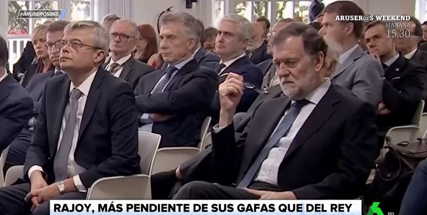 Se quita las gafas, se las vuelve a poner, se rasca la frente con las patillas, juega con ellas... "Yo soy el ponente y le digo '¡Mariano, vale ya con la gafa!'", asegura Alfonso Arús comentando este vídeo de Aruser@s en el que Mariano Rajoy protagoniza un cómico momento mientras el rey Felipe VI pronuncia su discurso en el Foro La Toja.