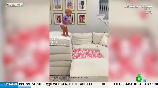 Un sofá, pelotas de goma y mucha imaginación. Eso es lo único que han necesitado unos padres para montar en su casa una piscina de bolas de la que el pequeño de la familia está disfrutando a tope.