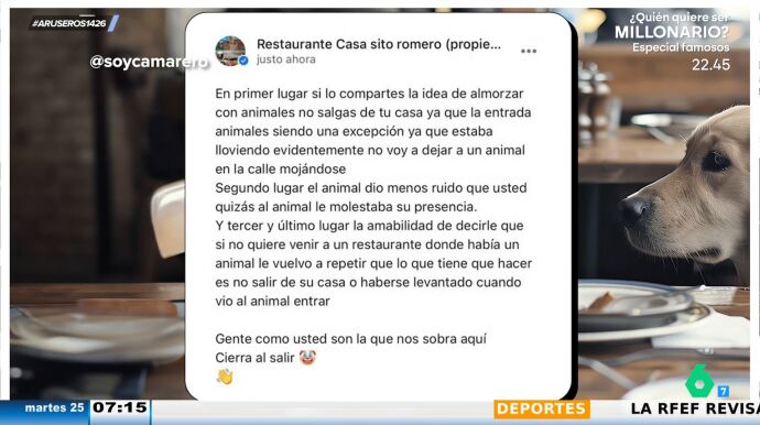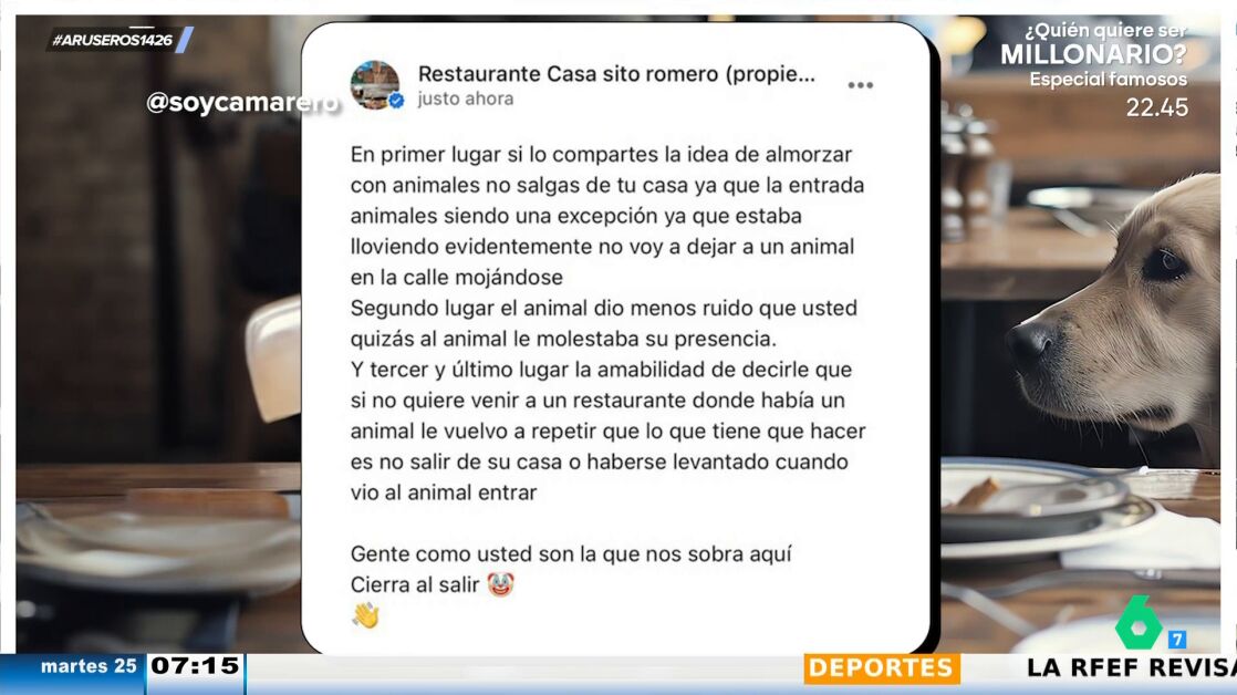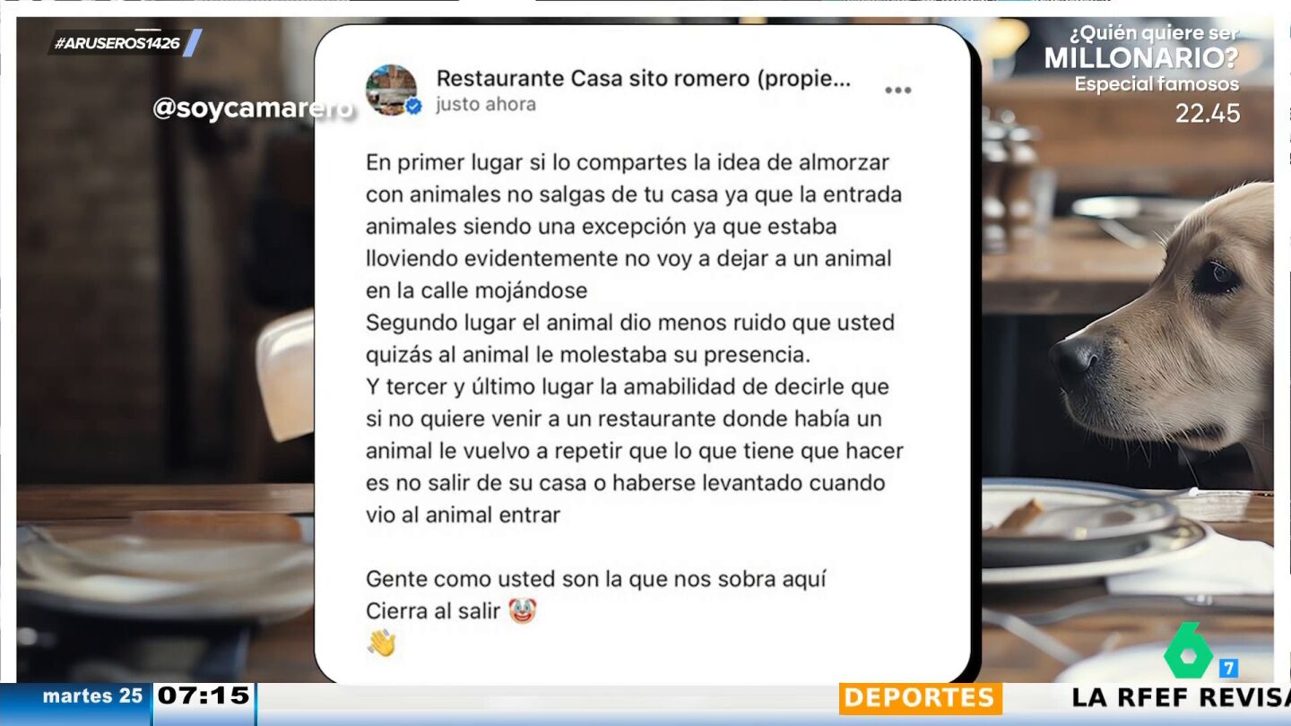 La cuenta de X (la red social anteriormente conocida como Twitter) de @soycamarero se hace eco de una situación que ha generado mucha polémica en redes... y el debate también ha llegado a Aruser@s. El cliente de un restaurante se queja en una reseña de Google de que el local en el que estaba comiendo permitiera la entrada de un perro porque fuera estaba lloviendo.