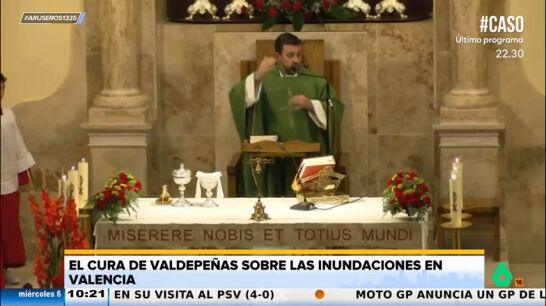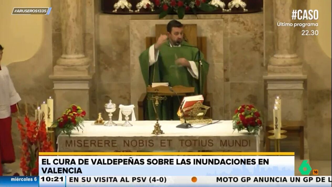 Alfonso Arús muestra en el vídeo principal de esta noticia el último viral del cura de Valdepeñas, que reflexiona sobre la monopolización informativa tras la trágica DANA que ha arrasado Valencia. "Esto puede durar meses, pero en cuanto dejan de salir en televisión pasa con el volcán de la Palma, que ya sale otra cosa nueva", critica el cura de Valdepeñas en plena misa.