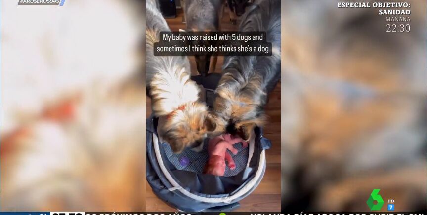 Anda a cuatro patas, come y bebe de los comederos, se cuela por la trampilla e incluso lleva los juguetes en su boca. Así se comporta esta pequeña niña que se ha criado con cinco perros.
