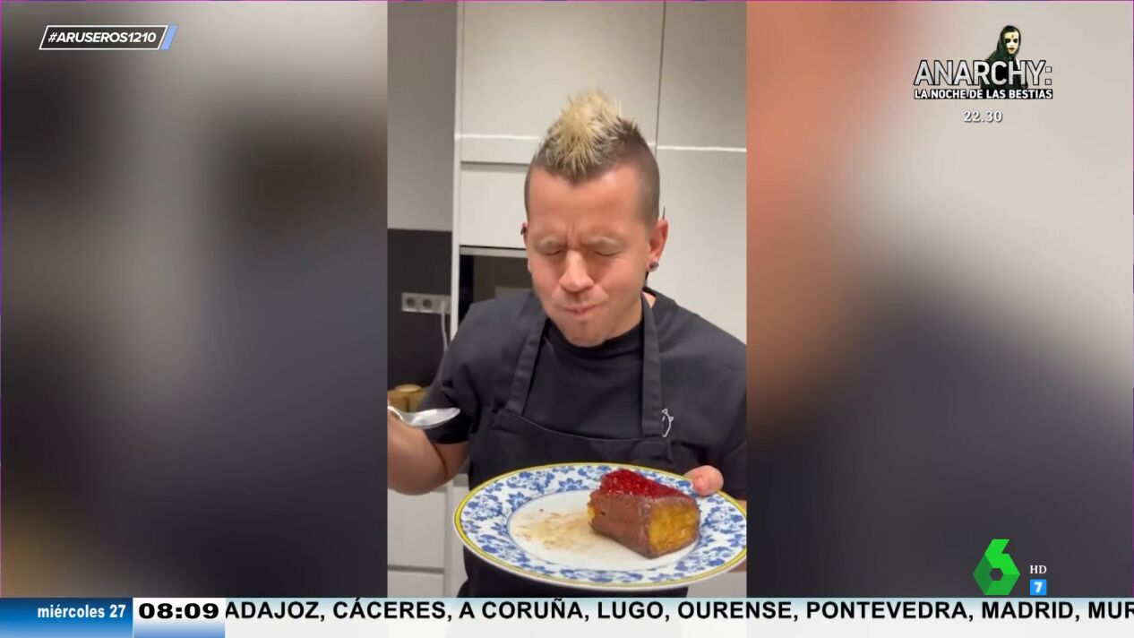 "Todas las torrijas son espectaculares, pero queremos incidir en la particular idea de Dabiz Muñoz", destaca Alfonso Arús en el plató de Aruser@s, donde afirma que puede servir de inspiración a la gente que quiere preparar torrijas en casa. "Yo lo siento, pero os voy a joder la dieta a todos", afirma el exitoso chef en el vídeo principal de esta noticia, donde desvela los secretos de su jugosa torrija.