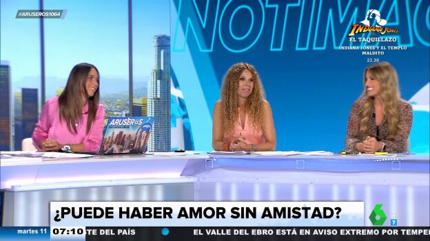No puede haber amor sin amistad. Al menos eso es lo que asegura con rotundidad Rocío Cano cuando Alfonso Arús pregunta a los colaboradores acerca de esta cuestión. "Es que una cosa es la atracción y otra es el amor. El amor sin amistad, como que no", afirma Angie Cárdenas, en la misma línea. Pero Patricia Benítez tiene una pequeña pega a lo que aseguran sus compañeras. "Yo creo que no, pero quiero hacer una pregunta. ¿Le explicas absolutamente todo a tu pareja? Porque eso lo haces con un amigo".