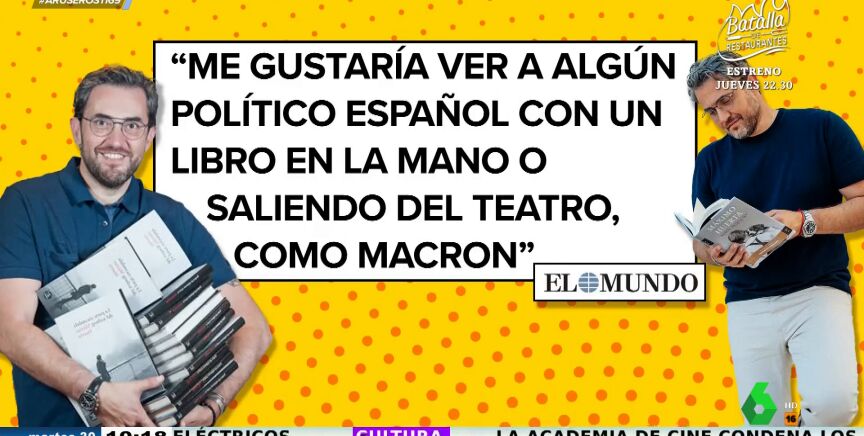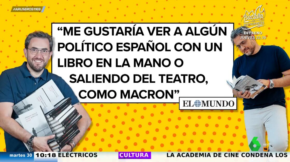 Alfonso Arús muestra en el vídeo principal de esta noticia el 'dardo' de Máximo Huerta a los políticos. Y es que, como destaca el presentador, el exministro de Cultura y Deporte "se está especializando en zascas". En su última declaración, el escritor afirma que le gustaría ver a "algún político español con un libro en la mano o saliendo del teatro, como Macron".