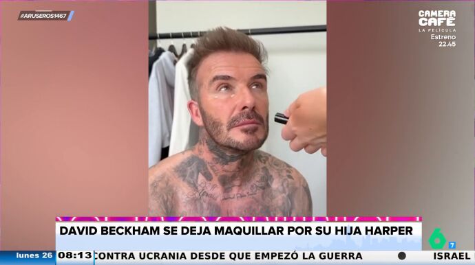 "Vemos cómo le aplica el corrector y la base", detalla la colaboradora en el vídeo, donde Alfonso Arús bromea sobre el físico de Beckham: "Si necesita tanto maquillaje es que no está tan bien".