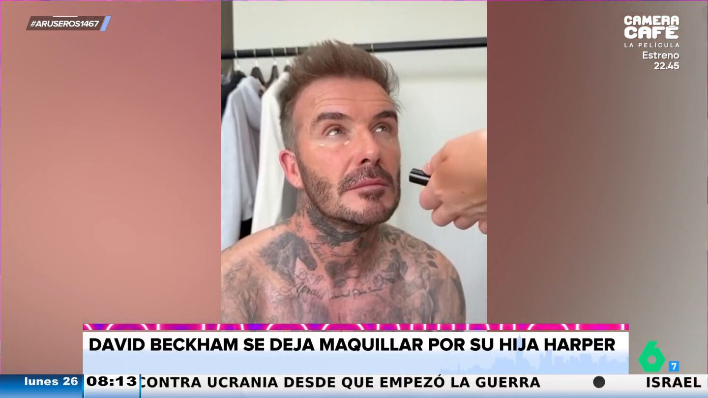 David Beckham protagoniza este divertido vídeo en el que se deja maquillar por su hija, Harper Beckham. "El otro día se dejaba masajear por su mujer con una cuchara y un tenedor y hoy le están tuneando", explica Alfonso Arús en el plató de Aruser@s.