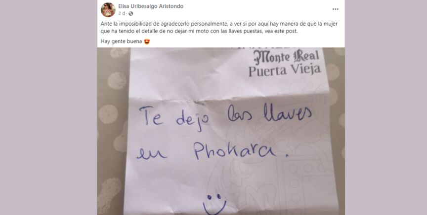 "Ante la imposibilidad de agradecerlo personalmente, a ver si por aquí hay manera de que la mujer que ha tenido el detalle de no dejar mi moto con las llaves puestas, vea este post", comenta la usuaria Elisa Uribesalgo Aristondo en la cuenta de Facebook de "No eres de Donosti si…", que intenta localizar y agradecer a la persona anónima que tuvo el amable gesto de guárdale las llaves que se había dejado puestas en su moto en una calle en San Sebastián. El bonito detalle evitó que le robaran el vehículo a Elisa.
