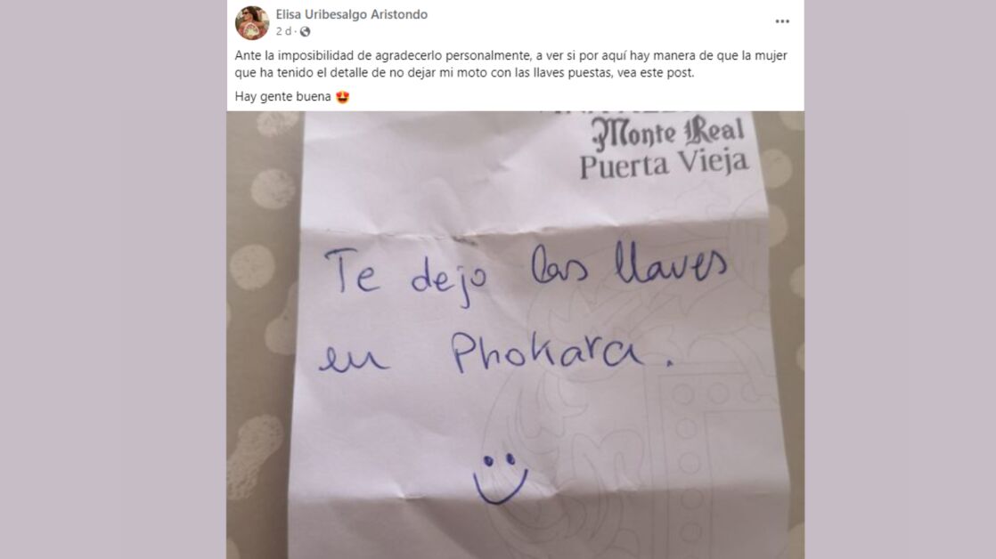 "Hay gente buena", añade la mujer en su comentario en la red social que enseña cómo la persona anónima le dejó una nota junto a una sonrisa dibujada como firma. "Te dejo las llaves en Phokara", le pone el ciudadano en la nota indicando así el bar donde dejaría las llaves a buen recaudo.