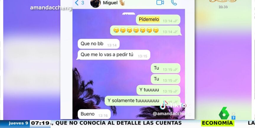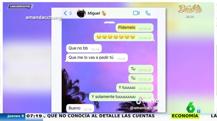 Hans Arús presenta en el plató de Aruser@s un debate que está arrasando en redes sociales tras salir a la luz las conversaciones de Whatsapp en las que una pareja discutía sobre quién debía pedir matrimonio a quién. Finalmente, ha sido la mujer la que ha pedido matrimonio a su novio. Como se puede ver en el vídeo principal de esta noticia, uno de los pide al otro que se lo pida mientras que este responde que, por favor, sea la otra persona.Esto ha generado un debate en X, (antes, Twitter) de los que están a favor y en contra, ya que estos últimos aseguran que si al final ha tenido que ser ella es porque el chico no tenía tantas ganas de casarse. Alfonso Arús analiza este debate en el plató, donde afirma que "si tienes que discutirlo en pareja es que algo va mal": "Si de forma espontánea pide alguien matrimonio podría ser cualquiera de los dos, pero si tienes que abrir una negociación sobre quién debe dar le primer paso, mal vamos". Una reflexión que comparten el resto de colaboradores.