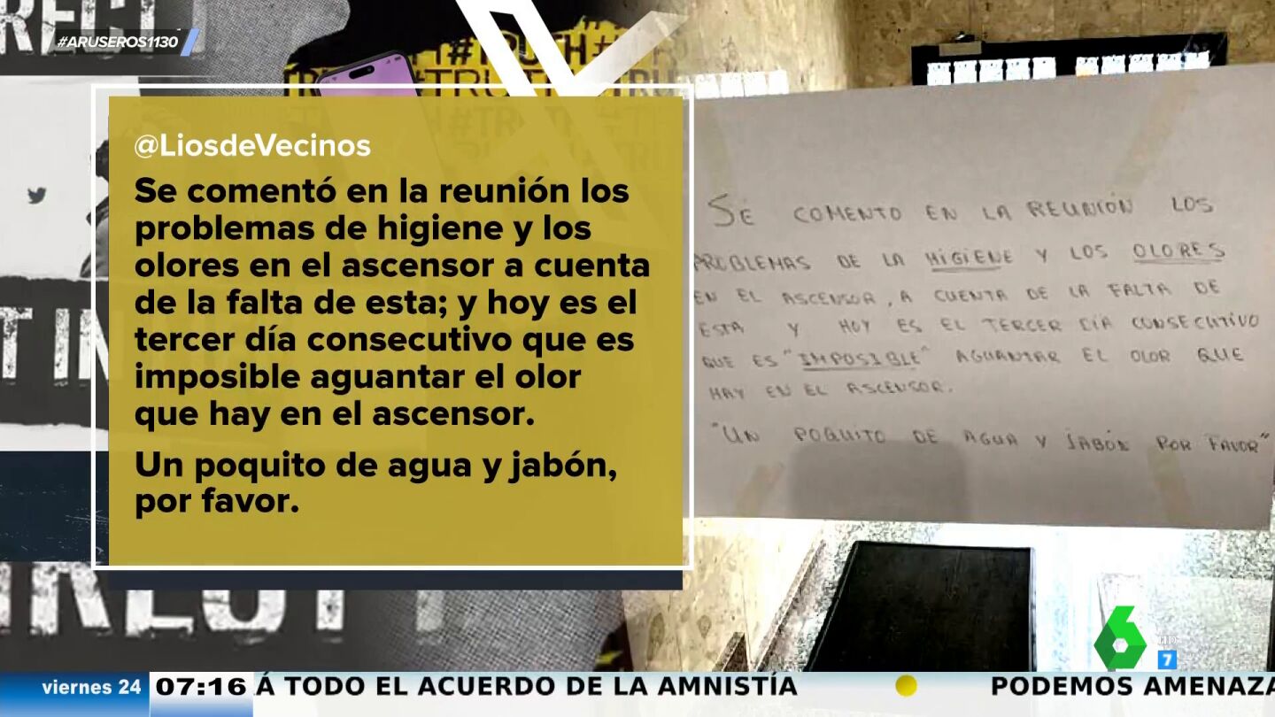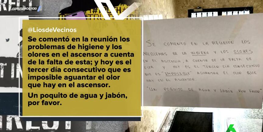 "¿Qué quiere decir el cartel? Que ya han tenido una junta para hablar de que es imposible subir al ascensor por lo mal que huele la gente". Es la conclusión de Hans Arús al leer esta nota que unos vecinos han colgado en el tablón de anuncios de su comunidad. En ella, se quejan de la completa falta de higiene de algún que otro inquilino o propietario.