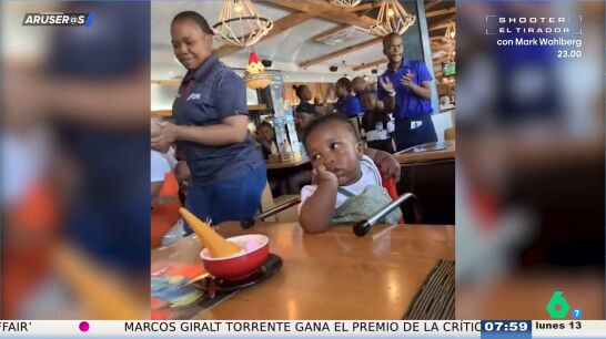 Se trata de un pequeño al que parece no hacerle ninguna gracia su gran día. Mientras su familia le sorprende con una tarta con bengalas en un restaurante, rodeado de gente cantando, su expresión no puede ser más indiferente.