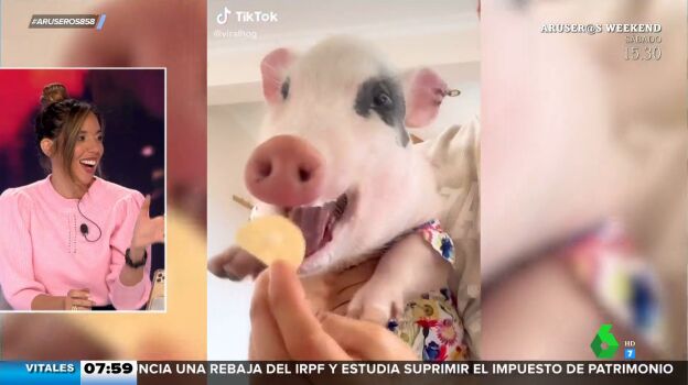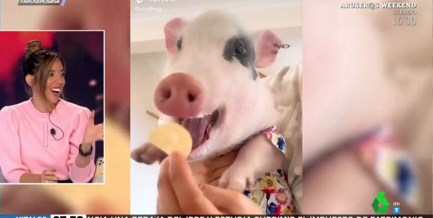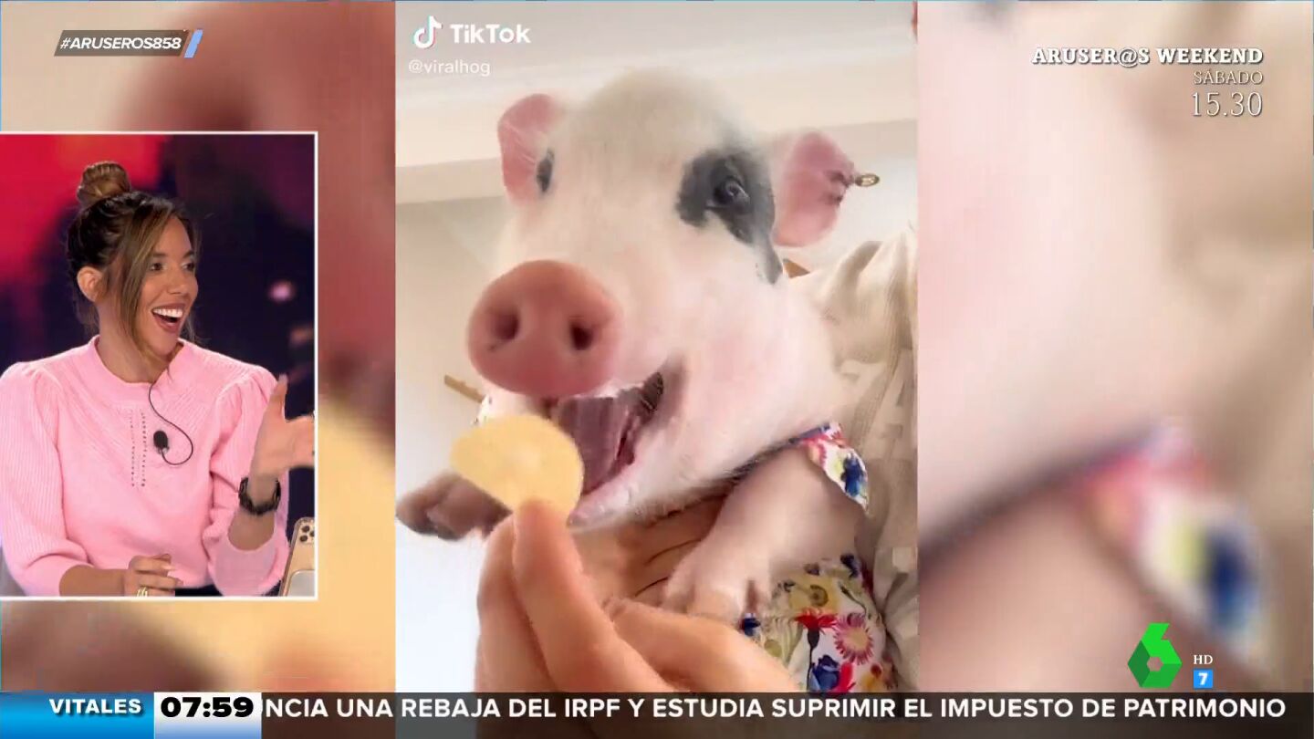 Con qué poquito podemos hacer felices a nuestras mascotas. Este es el caso de esta simpática cerdita que enloquece de alegría cuando su dueño le ofrece patatas fritas de bolsa para comer. Su divertida reacción ha provocado las risas en el plató de Aruser@s.