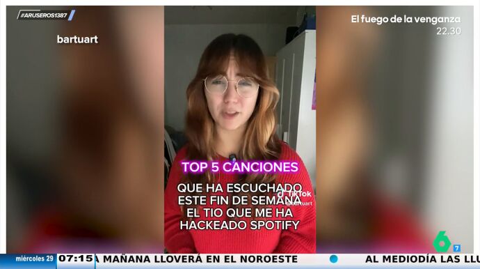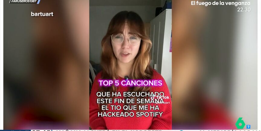 A la tiktoker @bartuart le ha hackeado el Spotify un hacker brasileño y se ha visto obligada a compartir cuenta con él. La chica hace en este vídeo viral, del que se hace eco el programa de Aruser@s, un repaso a la lista de canciones más escuchadas por este individuo. "Top 5 canciones que ha escuchado este fin de semana el tío que me ha hackeado Spotify", anuncia ella como si fuera Fernandisco.