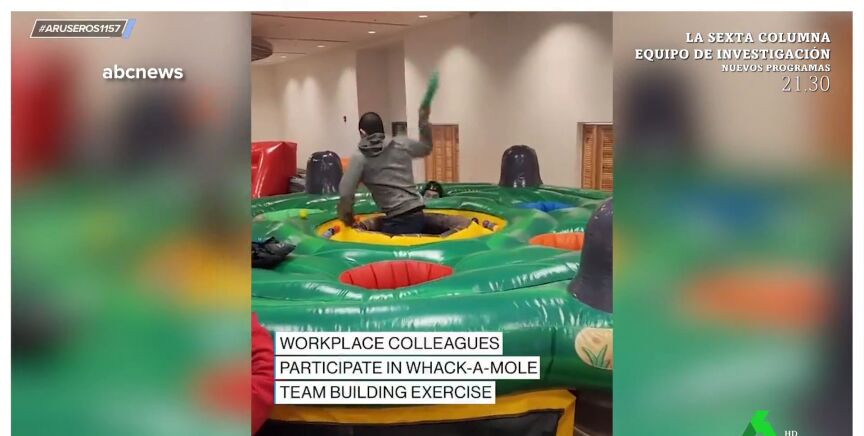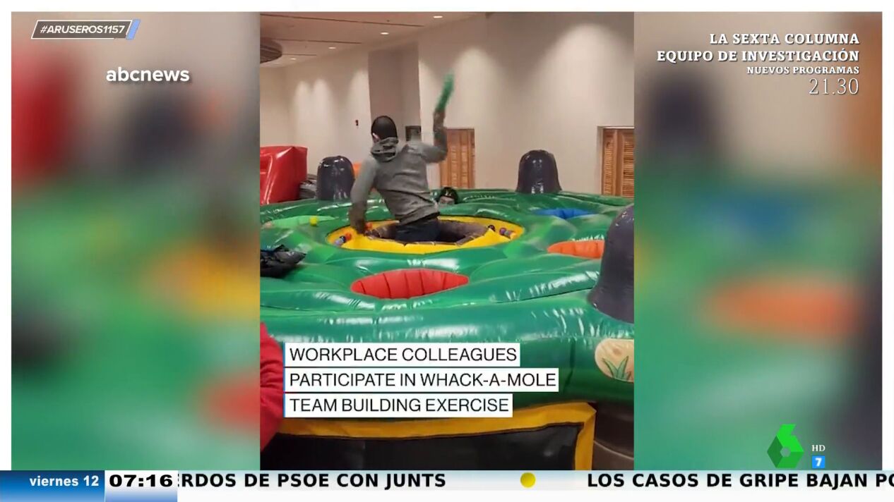 El presentador de Aruser@s está entusiasmado con este juego que se ha hecho viral y que las empresas utilizan para que sus trabajadores le digan adiós al estrés. Se trata del martillo de topos de toda la vida, pero con una pequeña variante...