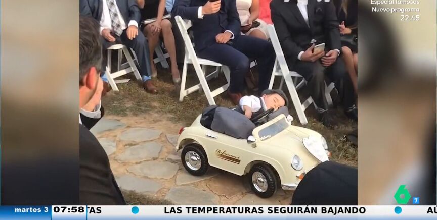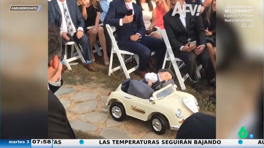 El divertido vídeo viral del bebé que se queda dormido en un coche teledirigido antes de entregar los anillos en la boda