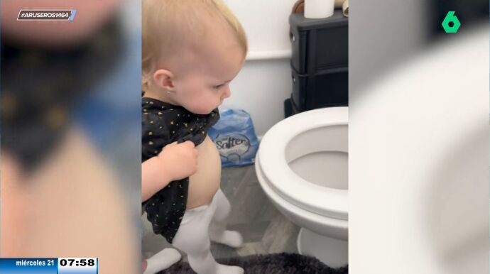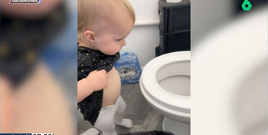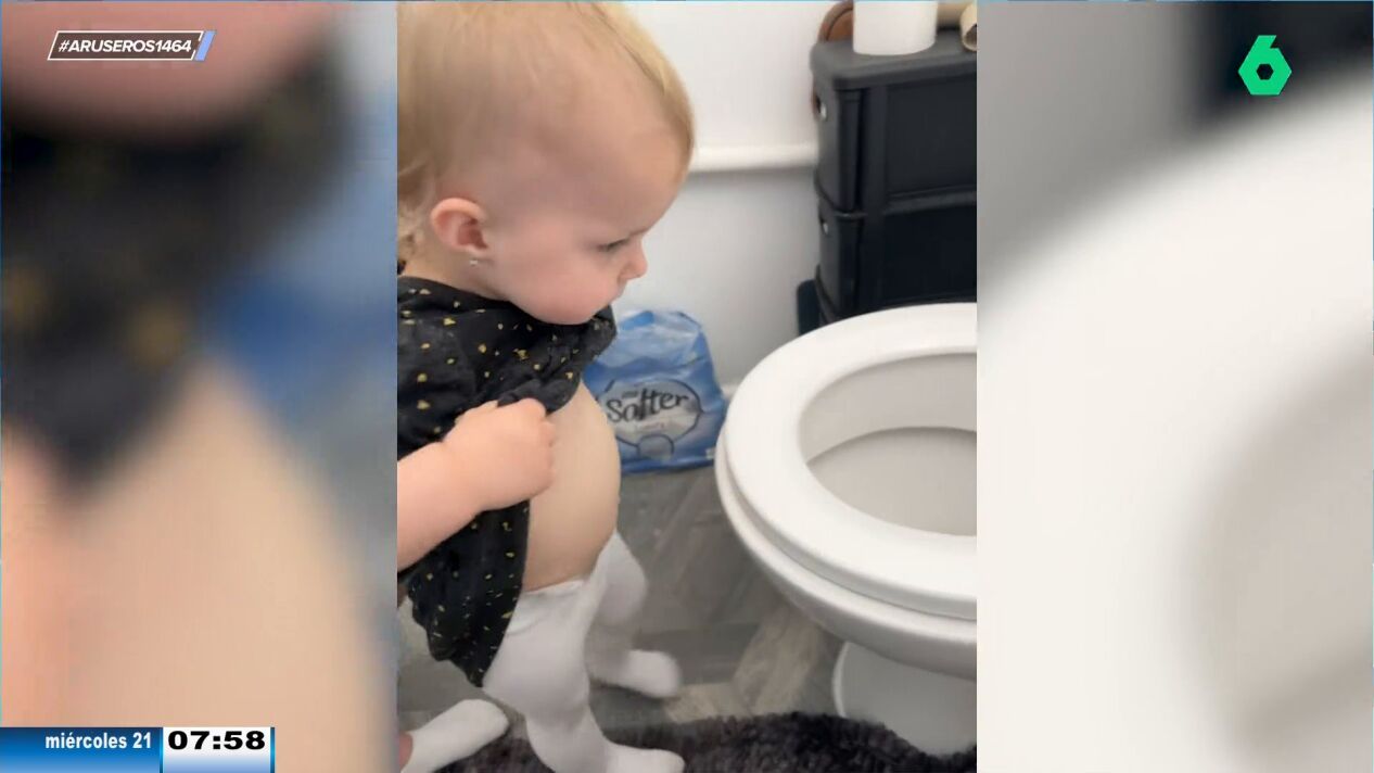 Nuestros amigos de Aruser@s están entusiasmados con este vídeo viral en el que una niña pequeña, que aún lleva pañal, se dispone a hacer pipí en la taza del váter... de pie, como lo hacen sus hermanos mayores.
