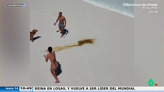 Como vemos en el vídeo que acompaña esta noticia, el can estropea el emotivo momento dejando un "regalito inesperado" sobre la arena.