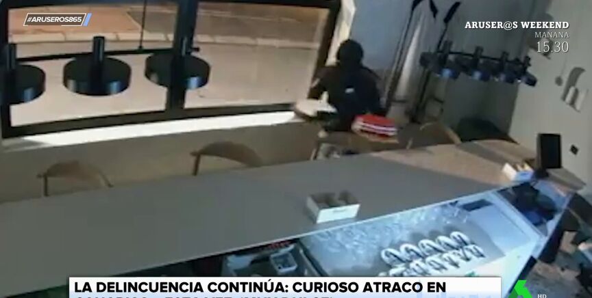 Mientras dos de ellos se emplean a fondo intentando abrir la caja registradora y la máquina tragaperras a golpes para llevarse el dinero, el otro centra su atención en dos tartas (una de 'red velvet' y otra de cerveza) que se encuentran encima de la barra del mostrador de la cocina.