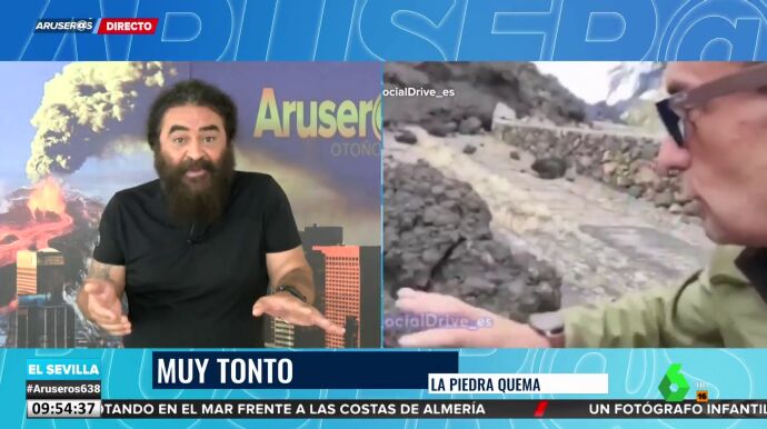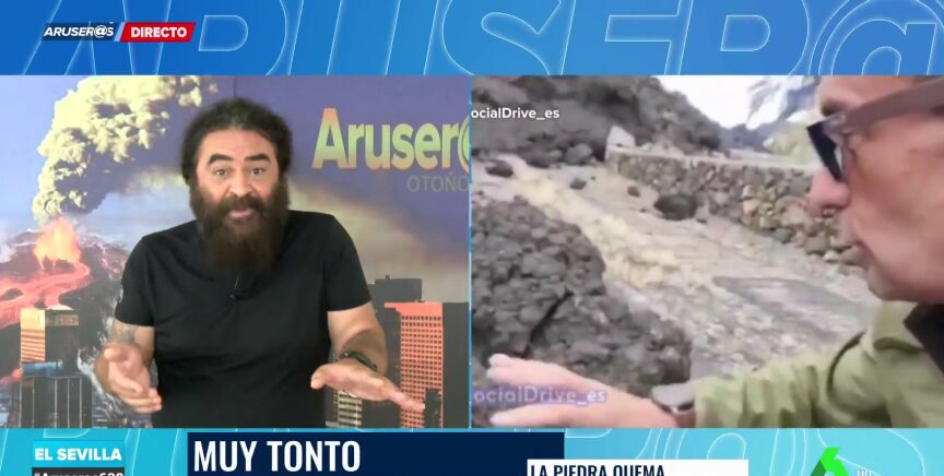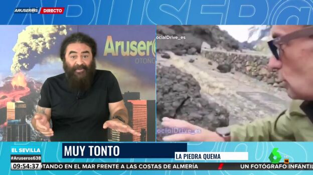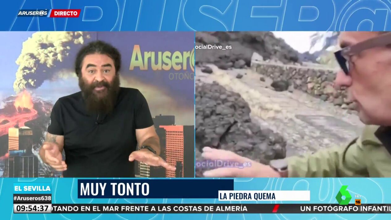 El Sevilla alucina con las imágenes y analiza su actuación en Aruser@s: "Cuidado con este hombre que ha hecho lo que suelen hacer los científicos: ser escéptico. Una cosa es ver que hay una piedra incandescente, que acaba de salir del volcán, pero tú no sabes si quema o no hasta que no la tocas. Si te quemas ya puedes certificar que la piedra estaba caliente", ironiza el humorista.