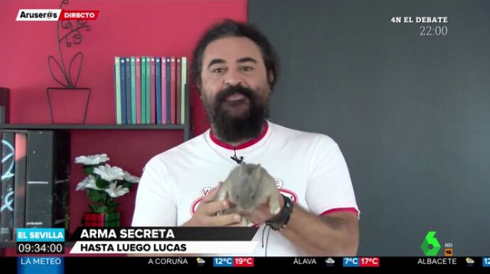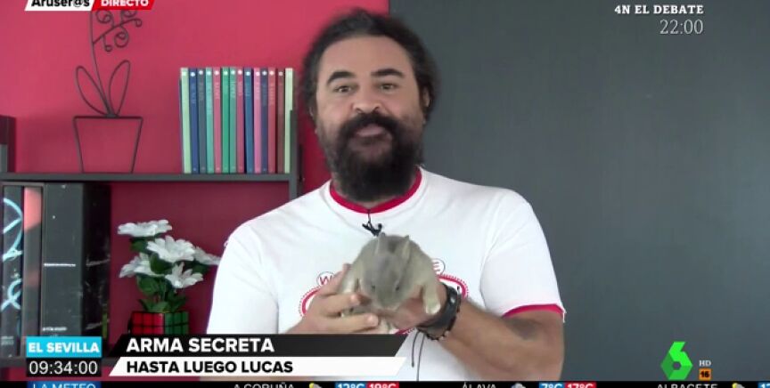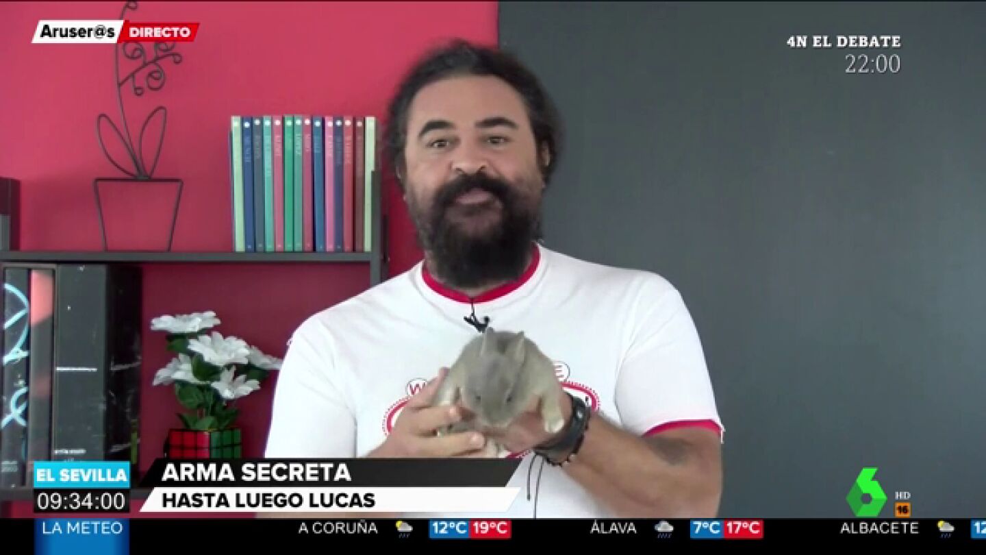 El colaborador de Aruser@s muestra a su "arma secreta" para incrementar la audiencia. El Sevilla prueba suerte como lo hace Rivera con el perro Lucas para aumentar votos. En este vídeo puedes conocer a Pimienta, el "arma secreta" del colaborador.
