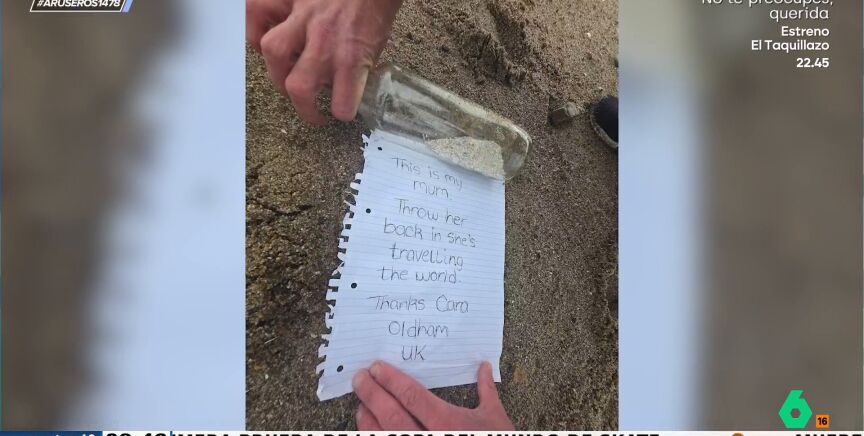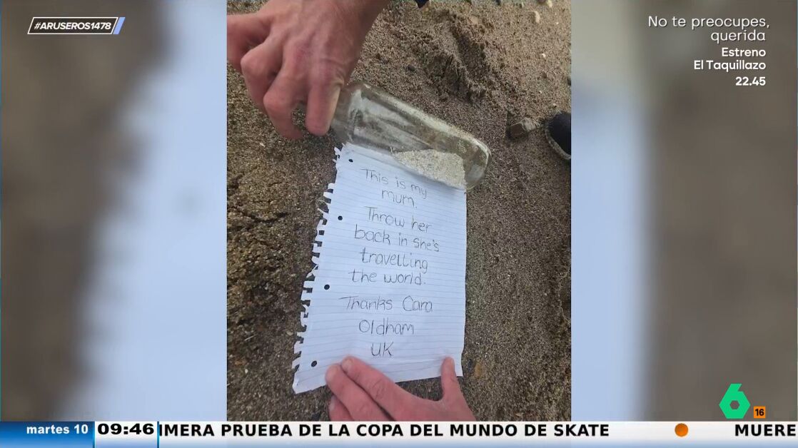 "Esta es mi mamá, vuelve a tirarla al mar porque está viajando por el mundo", pone en el mensaje guardado en el interior de la botella. "Debe de ser muy bonito encontrar esa botella en el agua, es algo muy espiritual", comenta Óscar Broc.