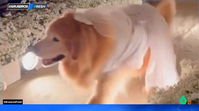 Con un vestido blanco y un velo, la perrita que protagoniza este vídeo viral desfila hasta el altar en el que se encuentran sus dueños, que están a punto de contraer matrimonio. Elegante como ella sola y con alegría, avanza algunos metros, observando a todos los asistentes, mostrando cierta curiosidad, pero sin perder de vista su objetivo.