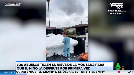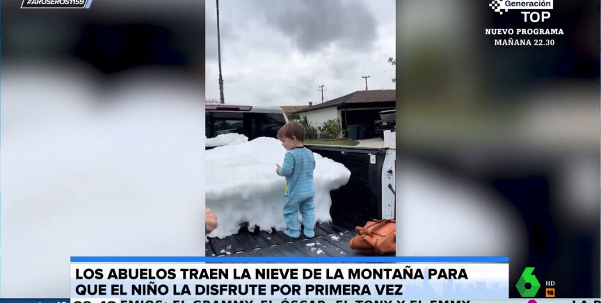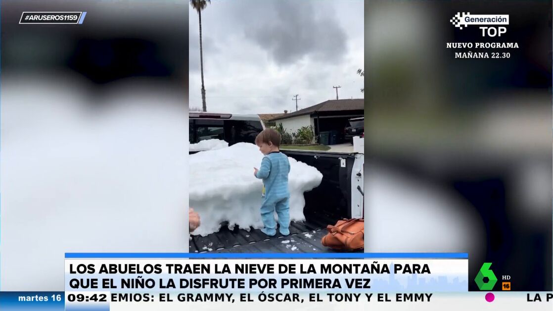 Aruser@s recupera el emotivo gesto de unos ancianos con sus nietos. Como se puede ver en el vídeo viral de portada, los pequeños quedan asombrados ante la carga que llevan sus abuelos. Los pequeños nunca han tenido la oportunidad de ver la nieve con sus propios ojos, de sentir su frescor en sus rostros. Por eso, sus abuelos la han llevado hasta ellos con la ayuda de su vehículo.