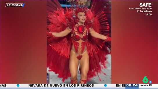 "No es nada fácil moverse a ese ritmo con esa increíble estructura que lleva en la espalda", explica Tatiana Arús, que destaca que lleva "unas alas" que deben pesar mucho. Por otro lado, la colaboradora amuestra el increíble traje que ha diseñado Dolce & Gabbana para la reina del Carnaval de Río de Janeiro: "Hasta 13 personas hicieron falta para la confección de ese diseño, por el que se necesitaron hasta 350 horas invertidas, ya que va cosido a mano piedra a piedra".