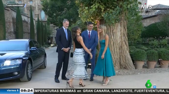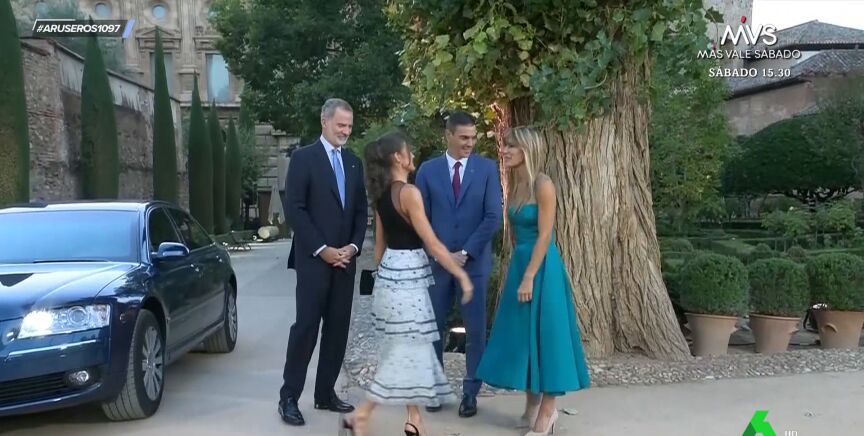 Tatiana Arús enseña en el plató de Aruser@s en el look elegido por la reina Letizia en Granada, donde medio centenar de líderes europeos se ha reunido para hablar en un acto en el que la inmigración y la guerra de Ucrania han sido los ejes centrales. En las imágenes se puede ver cómo la reina pasea junto a Begoña Gómez mientras delante de ellas hablan el rey Felipe y Pedro Sánchez.