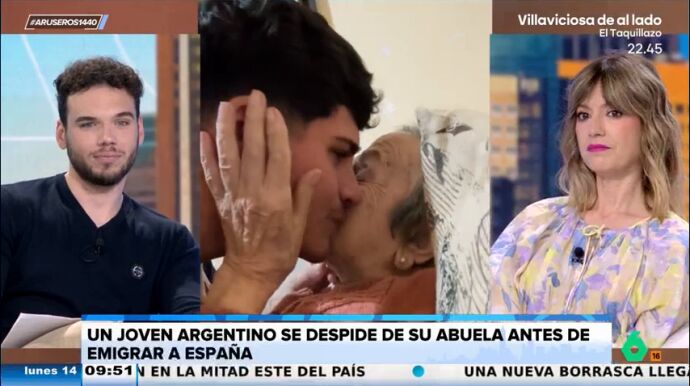 Alfonso Arús presenta este lunes en la sección de 'Super Olé' uno de los vídeos que más se ha viralizado en redes este fin de semana. Se trata de un joven argentino que ha tenido que despedirse de su abuela para emigrar a España a buscar trabajo y regresar con dinero. Un emotivo adiós que ha roto el corazón a los internautas.