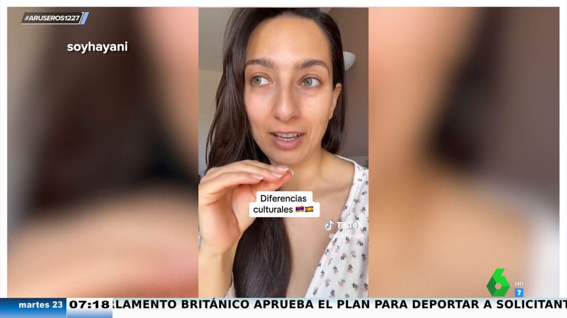 Esta creadora de contenido cuenta las diferencias en la forma de actuar entre Armenia y España cuando una familia tiene un bebé. Explica que en Armenia no se le dan besos al niño, a diferencia de lo que ocurre aquí.
