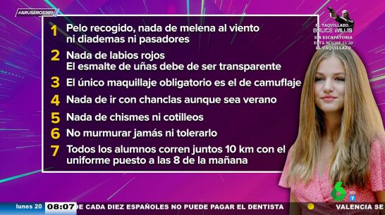 Con el pelo recogido, sin diademas ni pasadores, sin pintalabios rojo ni uñas de colores, con maquillaje de camuflaje, sin chanclas ni chismes o cotilleos... estas son solo algunas de lasreglas de la Academia militar a la que la princesa Leonor tendrá que asistir durante los próximos años. Además, deberá correr junto a sus compañeros a las 8 de la mañana 10 kilómetros un viernes al mes.