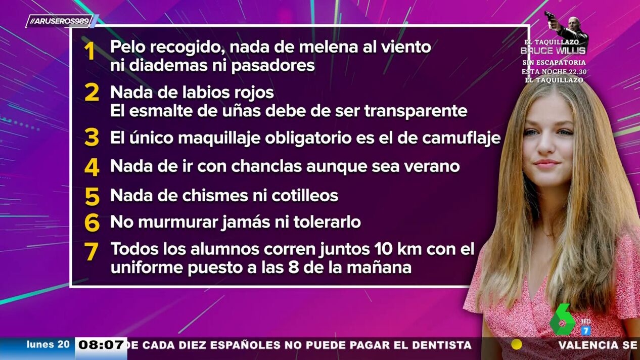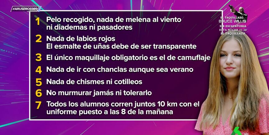 Tatiana Arús enumera en Aruser@s algunas de las normas que tendrá que acatar la princesa Leonor cuando comience el siguiente curso en la Academia militar de Zaragoza: desde correr 10 kilómetros a las 8 de la mañana a no llevar el pelo suelto.