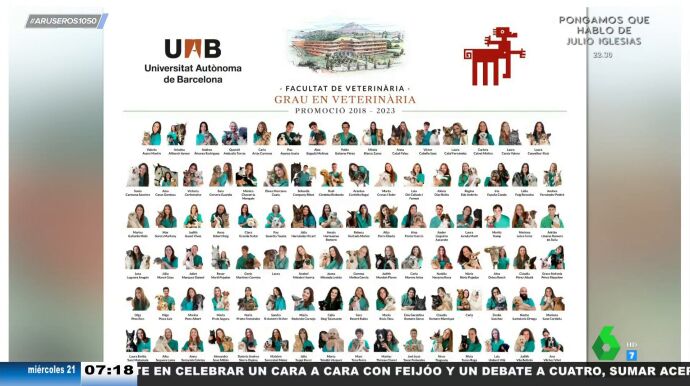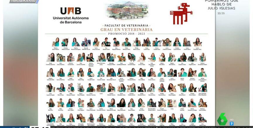 Gatos, caballos, perros y alumnos posan orgullosos en estas fotos que componen la orla de la carrera de veterinaria de la Universidad de Barcelona. La promoción 2018/2023 dice adiós a las aulas con este bonito recuerdo que comparte además con las mascotas de cada uno de los estudiantes, como podemos ver en esta imagen que enseña Hans Arús en Aruser@s.