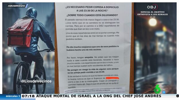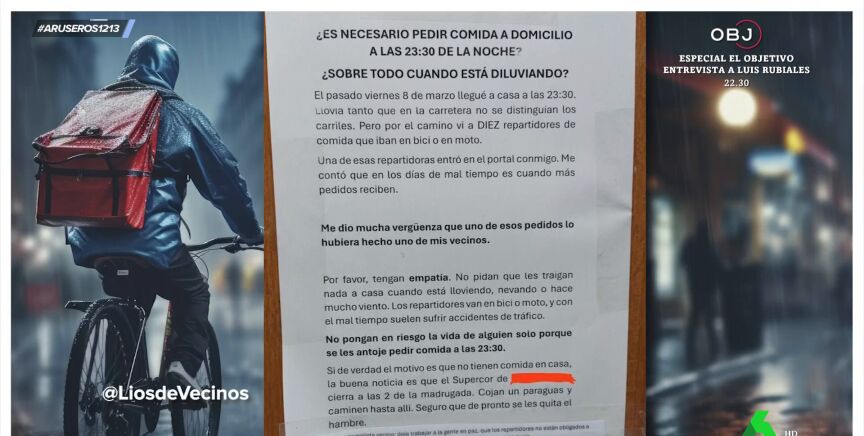 "¿Es necesario pedir comida a domicilio a las 23:30 h de la noche, sobre todo, cuando está diluviando?" Es la pregunta que encabeza este cartel, que se ha hecho viral por las quejas que en él expresa un vecino de un edificio. "El pasado 8 de marzo llegué a casa a las 23:30 h. Llovía tanto que en la carretera no se distinguían los carriles, pero por el camino vi a 10 repartidores de comida que iban en bici o en moto. Una de esas repartidoras, entró en el portal conmigo", cuenta en este escrito, en el que pide "empatía".