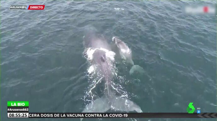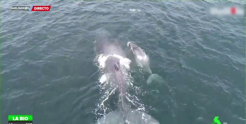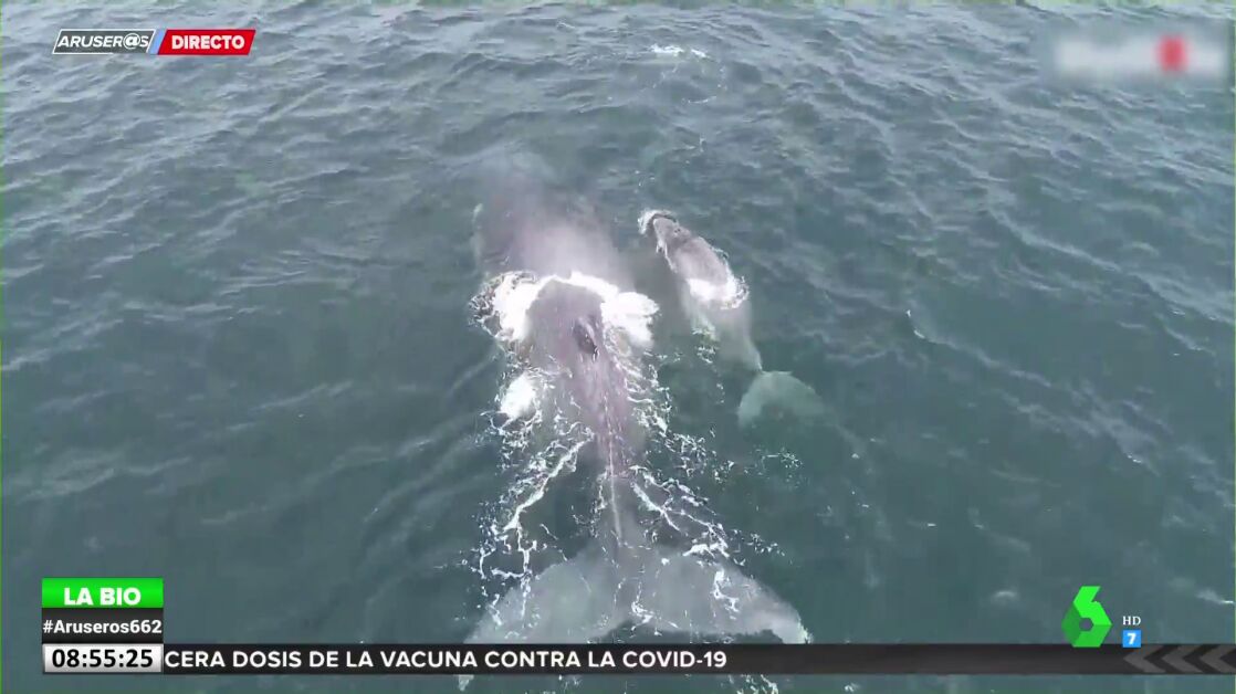 Un dron ha captado el momento de juego entre una cría de ballena y su madre. Esto es algo que le interesa mucho a Evelyn Segura ya que está investigando en un reportaje si los animales realmente juegan y según explica, sí, "los animales sí que demuestran que juegan, sobre todo estos pequeños ballenatos que se entretienen con su madre con la que tienen un gran vínculo".