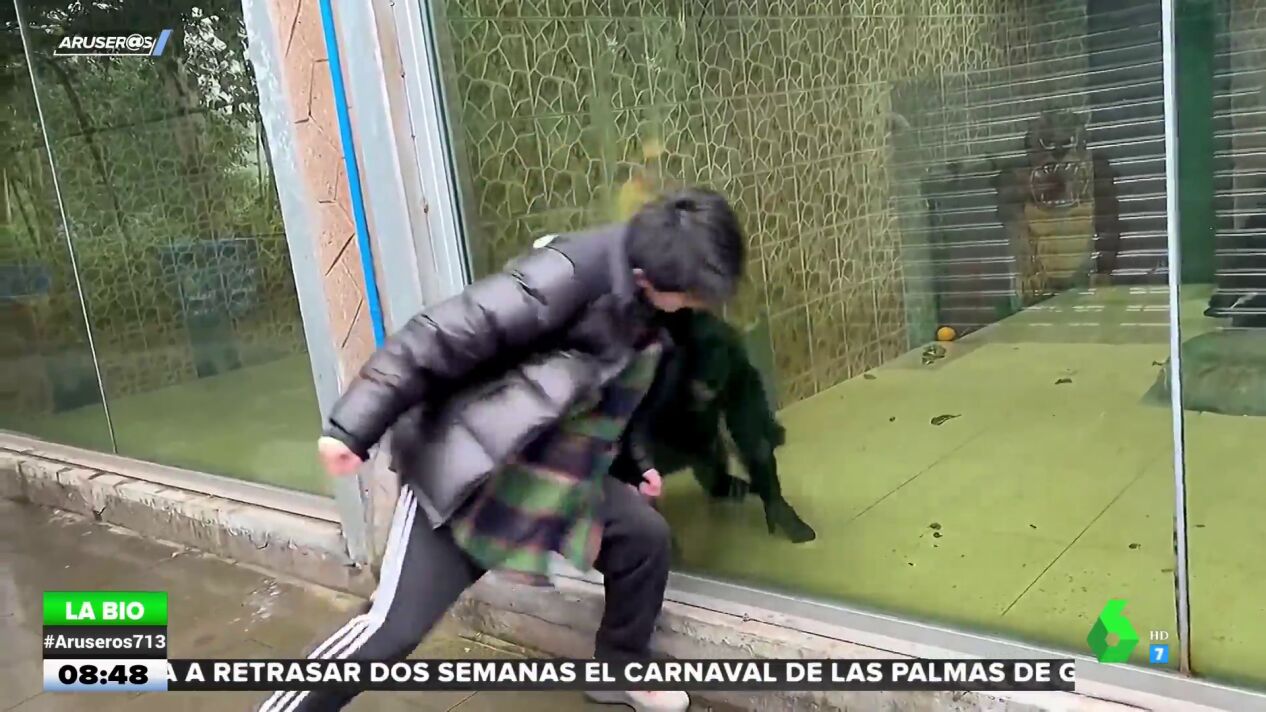Alfonso Arús muestra a Evelyn Segura un vídeo en el que dicen que un chimpancé imita los movimientos de un hombre. La bióloga de Aruser@s alucina con las imágenes y destapa toda la verdad. No imita al visitante del zoológico, "está defendiendo su territorio y defendiéndose a sí mismo de la agresividad de este visitante".