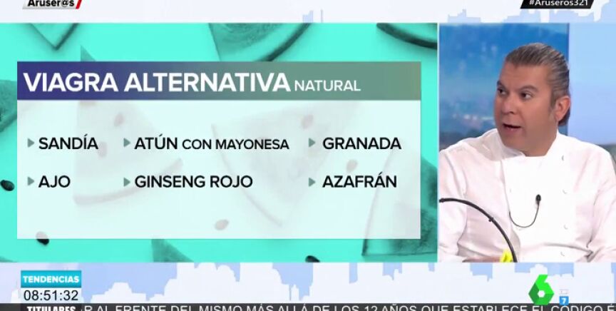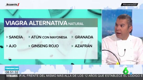 El chef explica que la viagra funciona como un vasodilatador que abre las arterias y hace que el flujo de sangre sea más intenso. Un efecto que se consigue también al ingerir sandía, granada, ajo, ginseng rojo, atún con mayonesa o azafrán, alimentos que hacen aumentar la potencia sexual hasta un 50%.