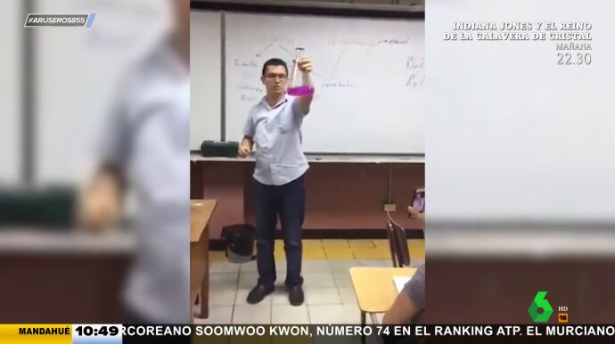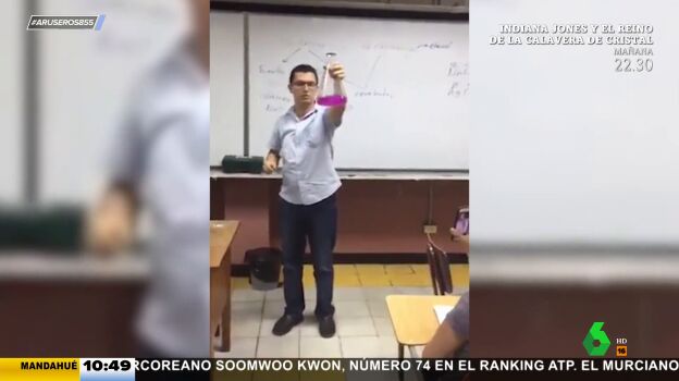 ¡Susto en el aula! Este profesor de química decide pasar de la teoría a la práctica y se dispone a hacer un experimento con sus alumnos como espectadores. Sujetando el matraz a muy poca distancia de su cara, el docente agita el contenido mientras explica a sus pupilos todos los detalles del protocolo. Sin embargo, algo sale mal y el recipiente estalla en mil pedazos.
