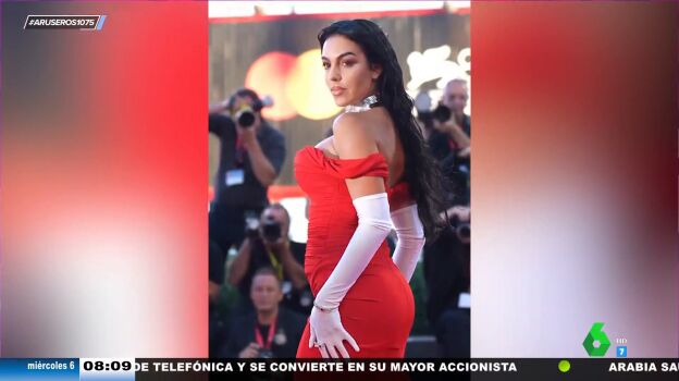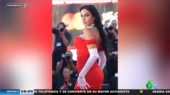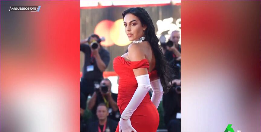 "Georgina Rodríguez ha llegado al Festival de Venecia en pantalón de chándal", destaca Alfonso Arús en el plató de Aruser@s, donde Tatiana Arús enseña los looks elegidos por la pareja de Cristiano Ronaldo. "Vemos el primer look que ha escogido para viajar de forma cómoda a Italia", afirma la colaboradora, que explica que "apostó por un diseño con escote corazón combinado con el chándal, joyas exclusivas y un bolso Birkin".