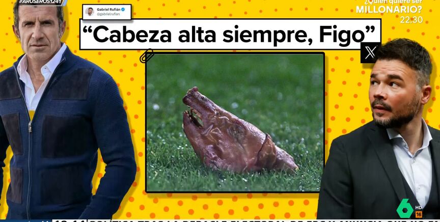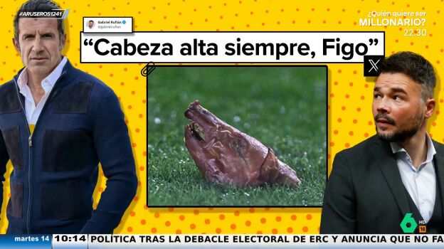 "Rufi, no sé nada de ti...", dice Figo tras las elecciones catalanas a Gabriel Rufián, que le contesta con un mensaje acompañado de una foto de la cabeza de cochinillo que le lanzaron en el Camp Nou: "Cabeza alta siempre".