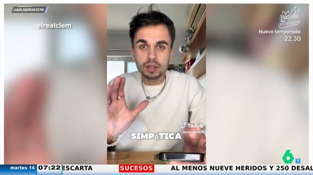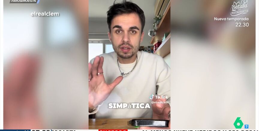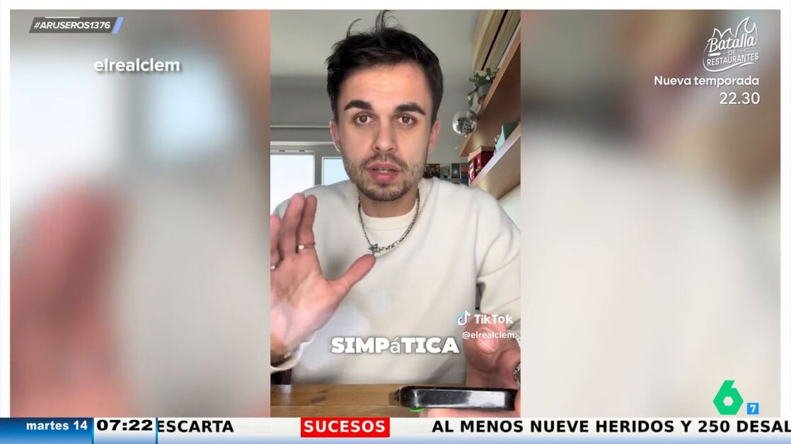 Alfonso Arús muestra en el plató los dos virales del creador de contenido '@elrealclem'. El joven francés ha explicado a sus seguidores los principales prejuicios que tienen los franceses de los españoles y, tras el revuelo generado, ha vuelto a subir otro vídeo sobre la percepción que tienen en España de los franceses.