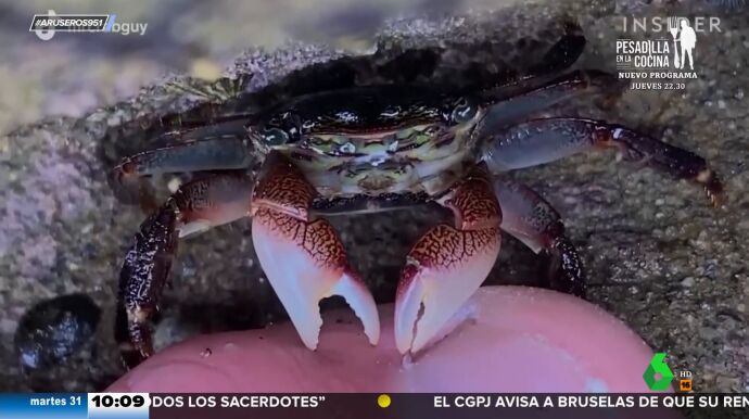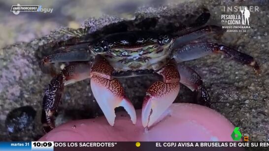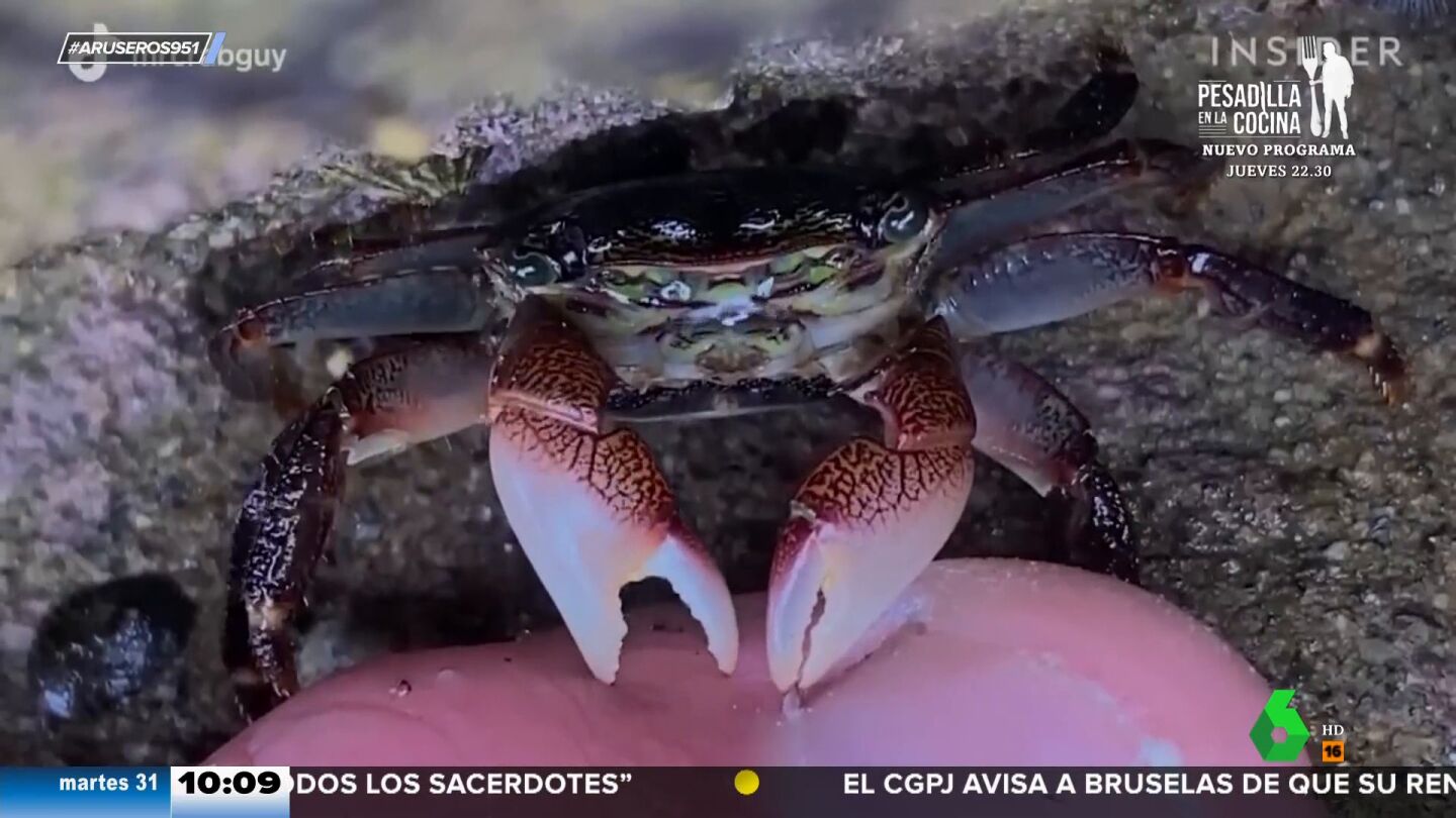 El vídeo de un cangrejo carnívoro que hace la pedicura se ha vuelto viral. Tal y como se puede apreciar en el vídeo, el animal va arrancando trozos de piel muerta con las garras y luego los va mordisqueando. "Es la secuencia que demuestra que el cangrejo te puede hacer la manicura por un precio asequible", comenta en directo Alfonso Arús.