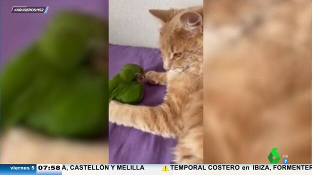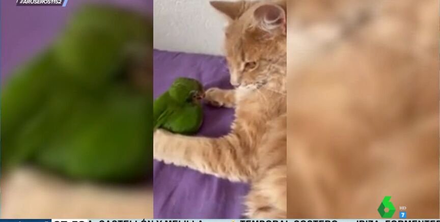 Este gato y este pájaro son grandes amigos. De hecho, el felino lo quiere tanto que todo su instinto se vuelca en proteger al lorito, que descansa plácidamente bajo su patita, sintiéndose cuidado y a salvo, como vemos en este vídeo viral emitido en Aruser@s. Los dos reposan tranquilamente sobre la cama hasta que la humana de ambos llega a la habitación en la que se encuentran.