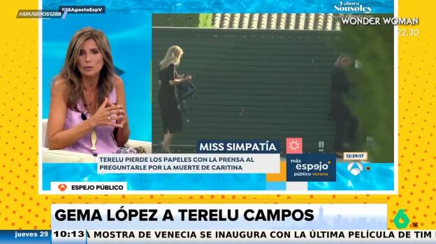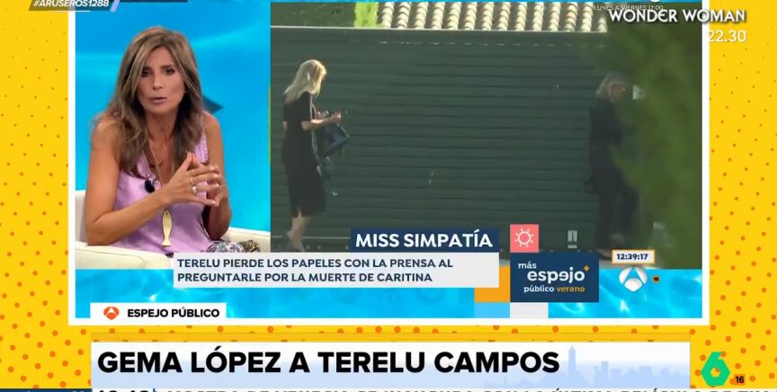 Gema López ha opinado en el programa 'Espejo Público' sobre la reacción de Terelu Campos con la prensa tras preguntarle por la muerte de Caritina Goyanes. Numerosos personajes de la crónica rosa y amigos íntimos se acercaron para acompañar a los familiares. Allí se encontraba Terelu Campos, que protagonizó un encontronazo con los medios de comunicación en su llegada al tanatorio de Tres Cantos.
