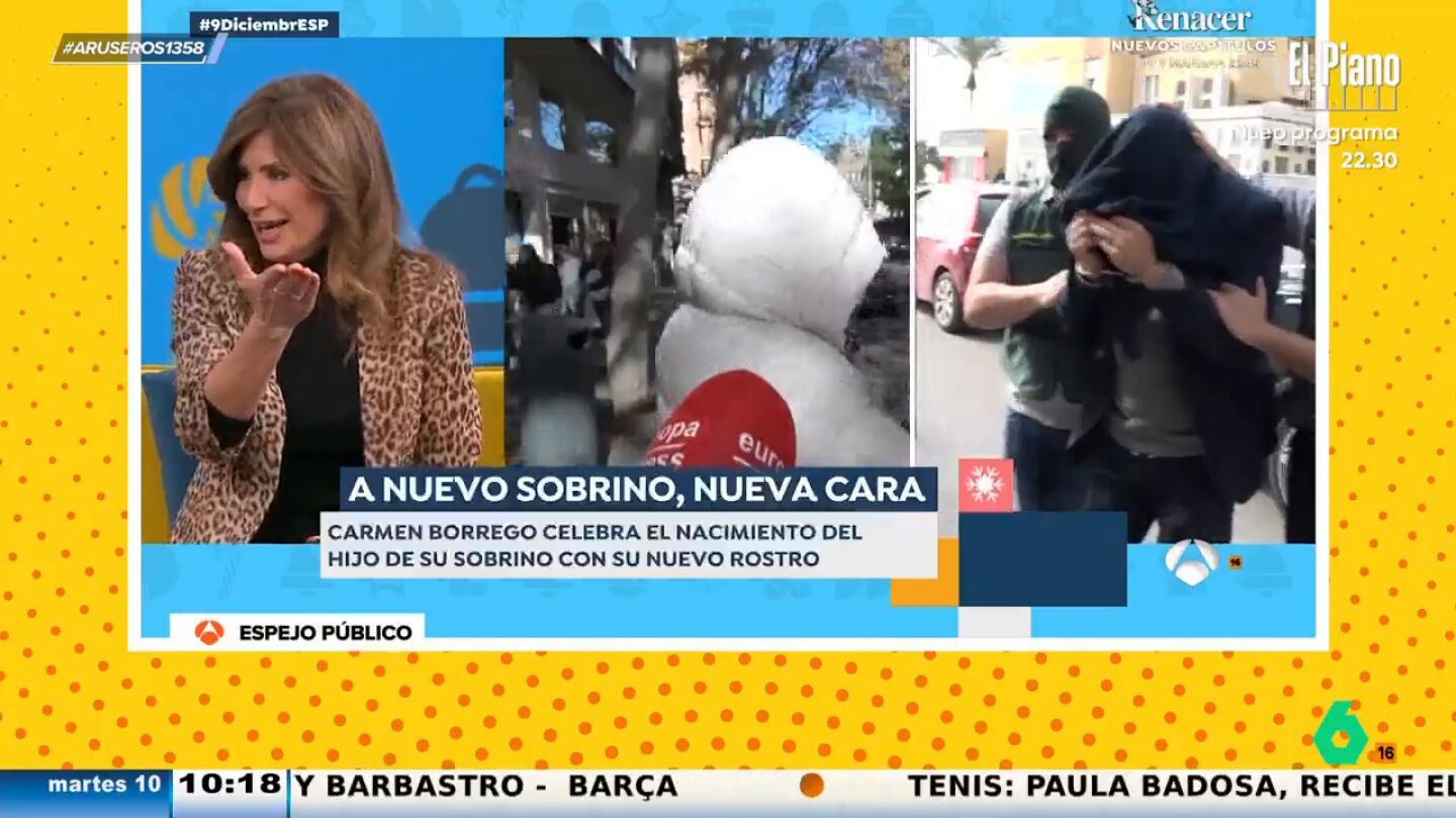 Y es que Carme Borrego aparece totalmente tapada con su abrigo. Angie Cárdenas explica el posible motivo en este vídeo: "Aquí la historia es que ella quiere preservar la cara porque parece ser que se ha operado y tendría alguna exclusiva de por medio". "Entonces quiere visitar a su sobrino, pero no quiere enseñar la cara", detalla.