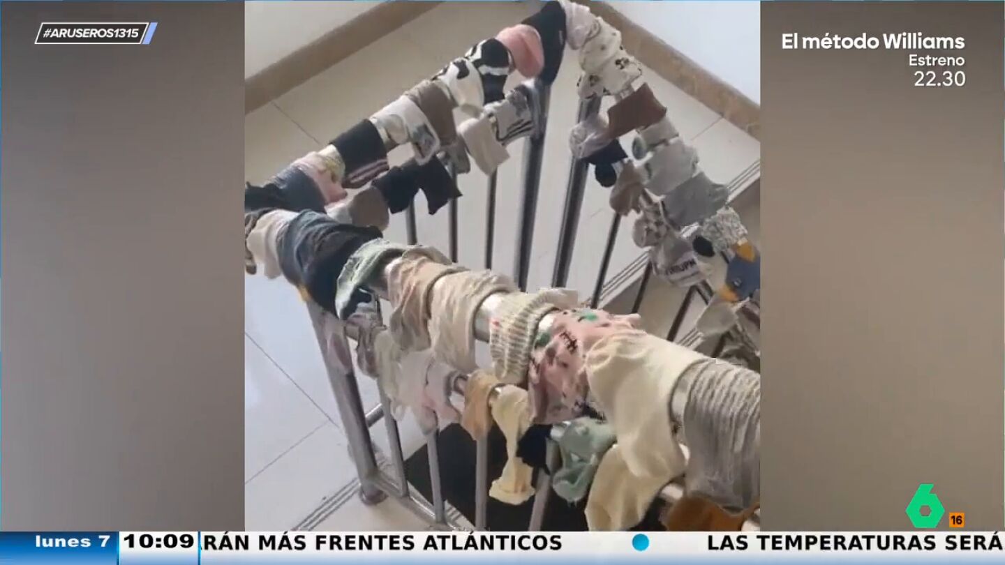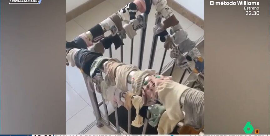"En el caso de que todos estos calcetines sean de un solo inquilino… Me parece una barbaridad", asegura Alfonso Arús al ver los cientos de calcetines que algún vecino ha decidido colgar en la barandilla común del bloque. Como vemos en las imágenes, uno de los inquilinos de la comunidad ha decidido grabar cómo alguien ha puesto todos sus calcetines a secar en las escaleras.