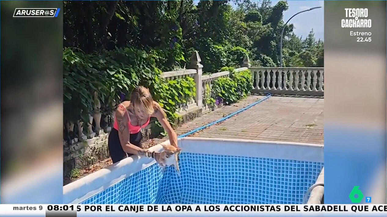 El perrete, con un acto reflejo automático, comienza a mover sus patitas como si estuviese nadando en pleno océano, aunque lo único que hay bajo él es el fondo seco de la piscina. La escena ha provocado las carcajadas de su dueña y también a los colaboradores de Aruser@s en plató.